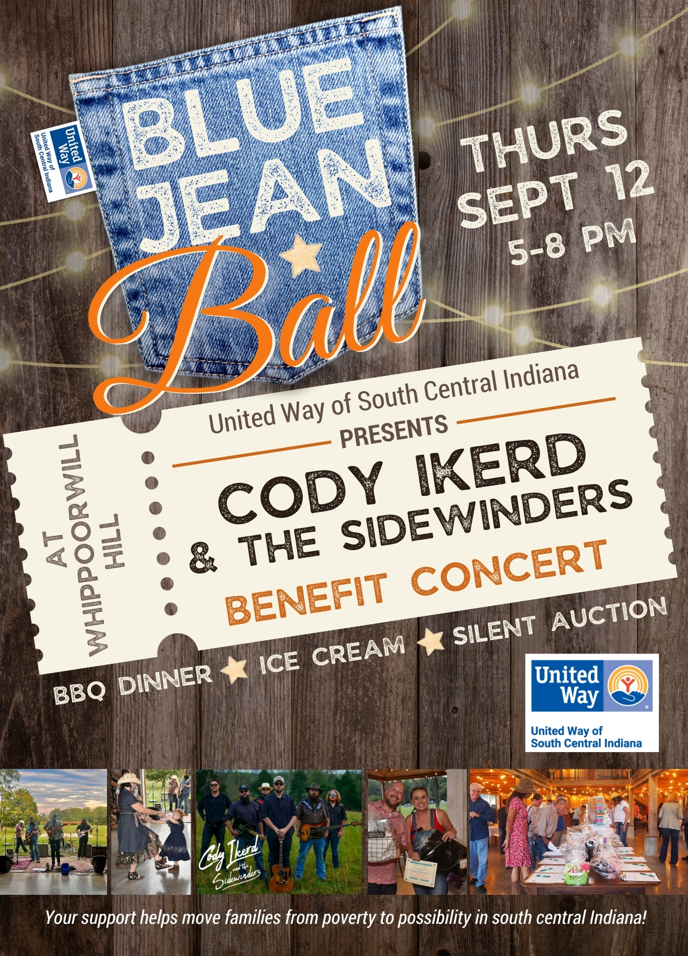 Join United Way of South Central Indiana at the 2nd Annual Blue Jean Ball on Thursday, September 12th, from 5-8 pm. This fun-filled benefit concert raises money and brings people together for a memorable evening at the Whippoorwill Hill historic barn nestled in the rolling countryside -- live country music, BBQ, ice cream, and a silent auction. No need to get fancy - come as you are and plan to have a great time!