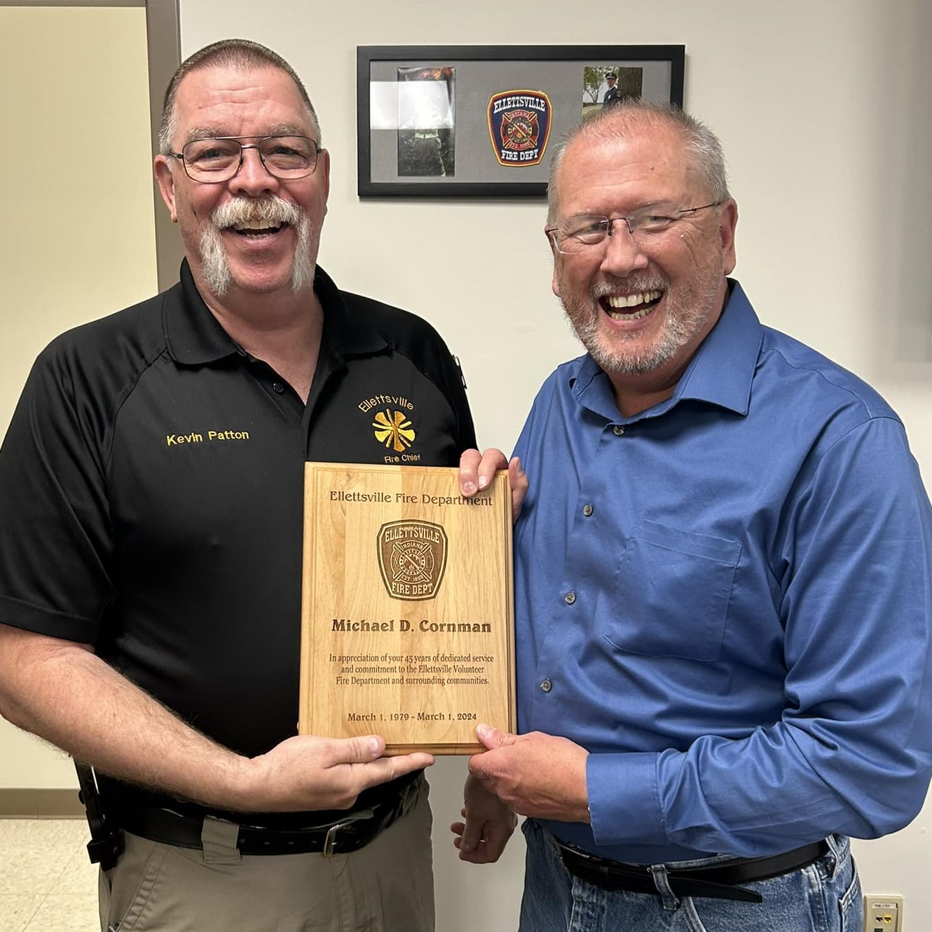 On May 16 Ellettsville Fire Chief Kevin Patton presented retired Chief Mike Cornman with a plaque for his 45 years of service. Congratulations on a great accomplishment and thank you for the years of service you provided the community.