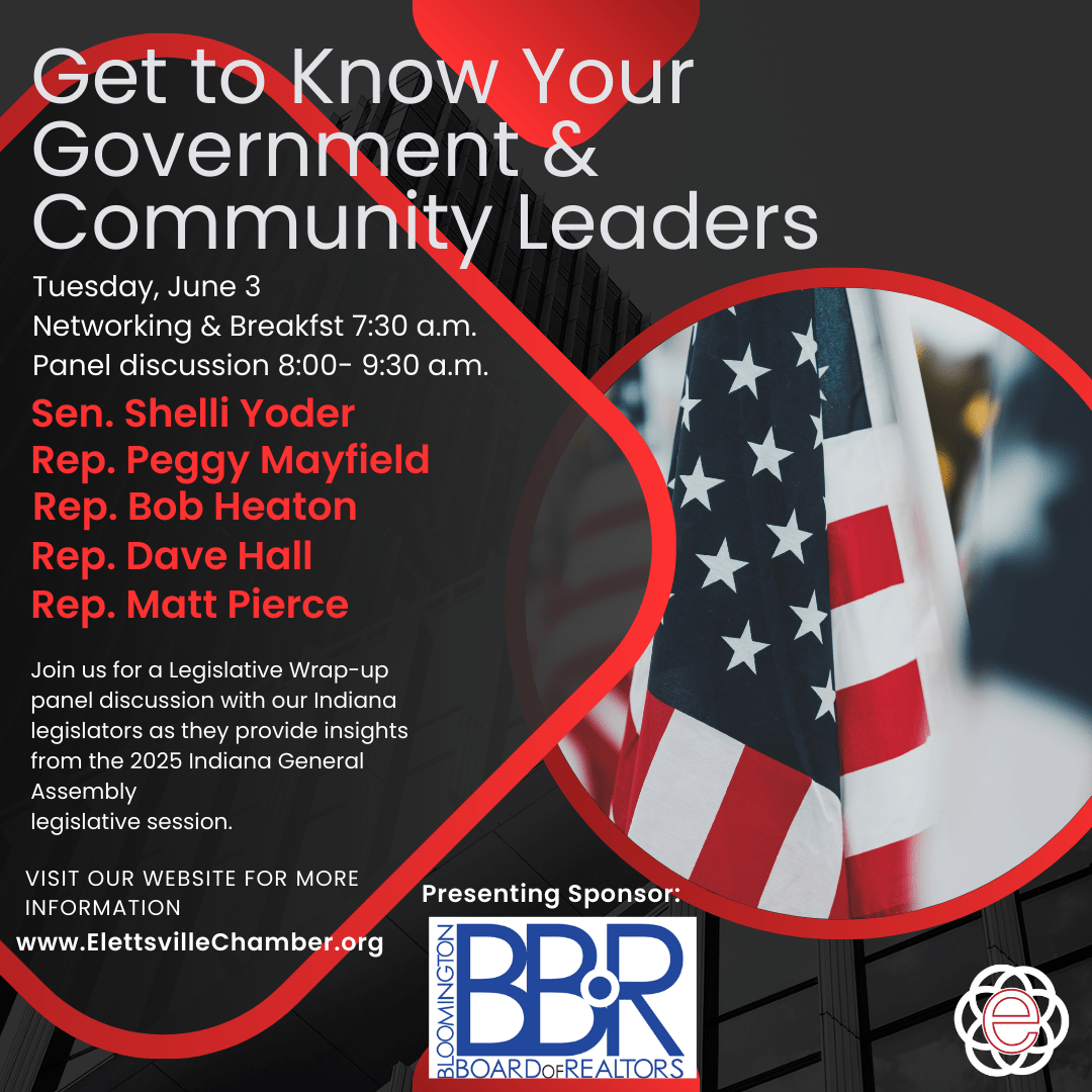 Join us for a panel discussion with our Indiana legislators, Sen. Shelli Yoder, Rep. Peggy Mayfield, Rep. Bob Heaton, Rep. Dave Hall and Rep. Matt Pierce. They’ll share insights and takeaways from the 2025 Indiana General Assembly session, highlighting key legislation that passed and what it means for the Ellettsville area business community and local government. Members can ask questions, stay informed, and engage in meaningful dialogue with our legislators.