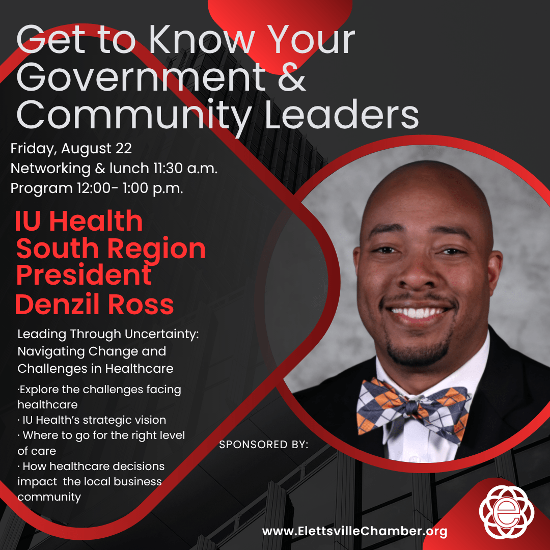 Join us August 22, for an engaging presentation by Denzil Ross, President of IU Health’s South Central Region. Learn more about the healthcare landscape in our area, IU Health’s strategic vision, and how decisions made within the healthcare sector directly impact local employers, employees, and the broader Ellettsville community. Members will have the opportunity to ask questions, gain insight, and contribute to a stronger connection between business and community health leadership.