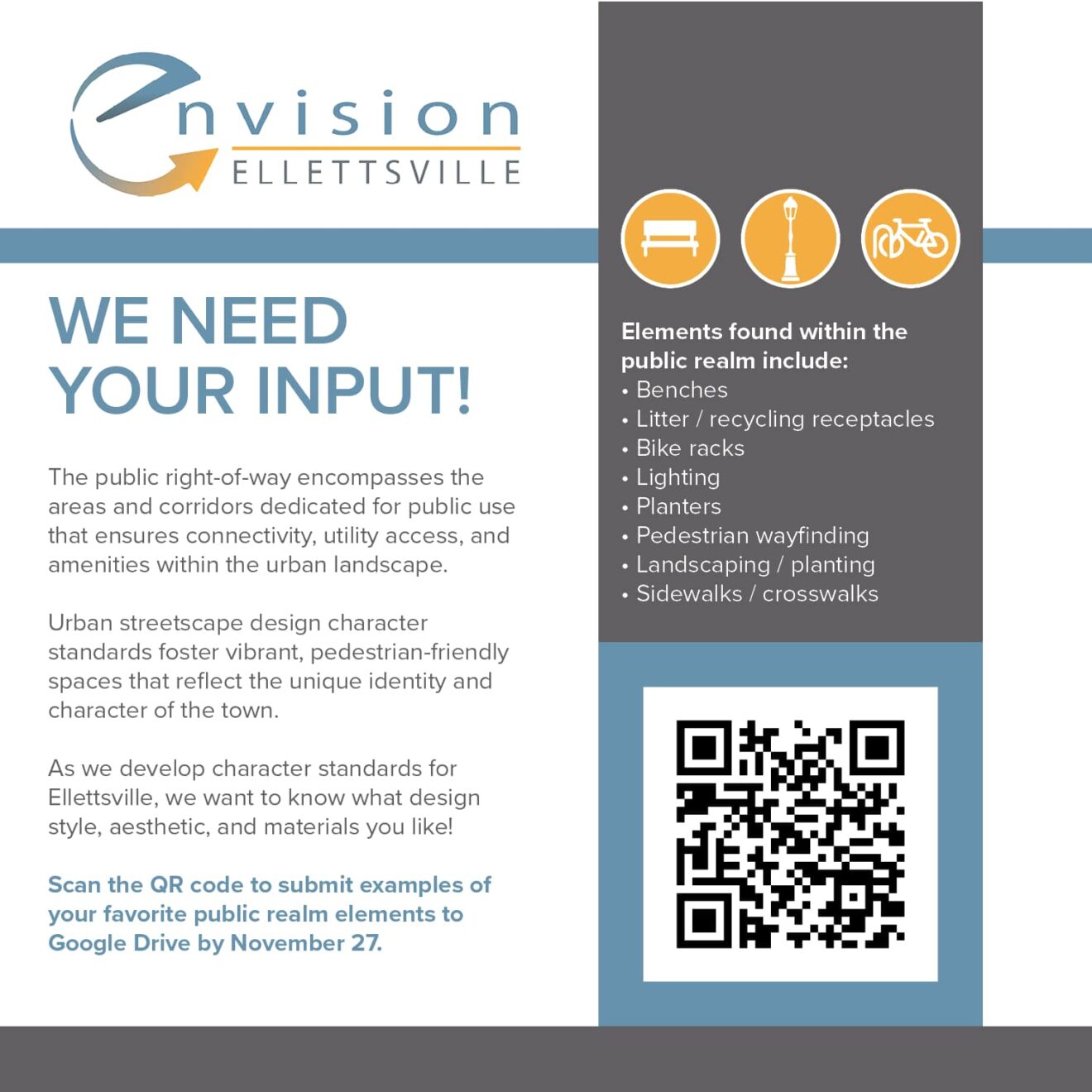 The Envision Ellettsville Task Force has been working hard to determine the character of parts of town. At their last meeting they identified design elements for public spaces, things like benches, lights, and signs. What should those elements look like? You can participate too. If you see something that “fits” Ellettsville, snap a pic and upload it to this Google drive. The drive will be open until November 27.