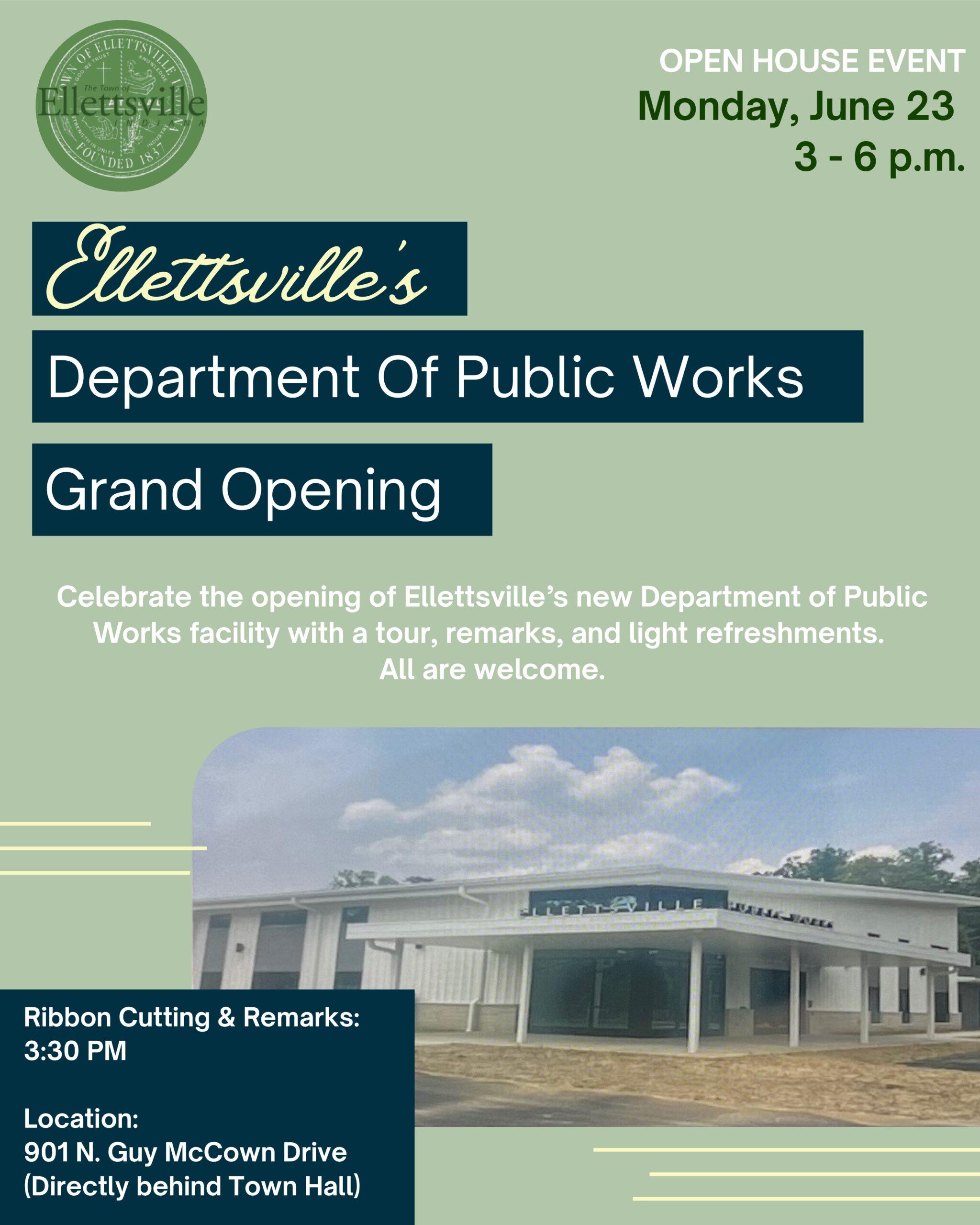 Event: Ribbon Cutting & Open House at the new Depatment of Public Works building Date: Monday, June 23 Time: 3:00 – 6:00 p.m. Location: 901 N. Guy McCown Drive (Directly behind Town Hall)